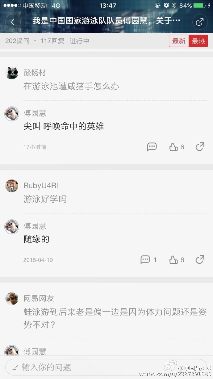 傅园慧:已经是最好成绩了。我用了三个多月去做恢复,鬼知道我经历了什么,真的太辛苦了,有时候我都觉得我快要死了,我当时的训练真是生不如死,但今天的比赛我已经心满意足了。
