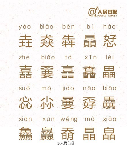 来,先试试小书虫为你准备的几个字:①最有钱:赑,读作bì,指用力的样子;②最闹腾:骉,读作 biāo,指许多马跑的样子;③最迷人:瞐,读作mò,指美丽的眼睛;④最能说:譶,读作tà,指说话快;⑤最多心:惢,读作suǒ,表示疑虑;⑥最丰盛:鱻,读作xiān,指新鲜。