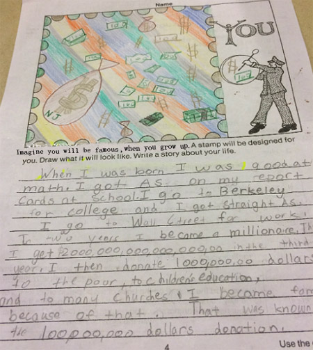 下面就是我家儿子的大作。大意是"我出生的时候数学就特别好,后来大学去了伯克利,拿得都是全A的成绩,然后毕业后奔赴华尔街,在花街的第二年就成了百万富翁。第三年就已经拥有财产达到2后面多得数不过来的0.然后我捐献出一亿用来救济穷人,儿童教育,支援教会建设。这就是著名的一亿捐款。" 看了儿子的大作,不由地想起那句话:"君子爱财,取之有道,用之有度"。