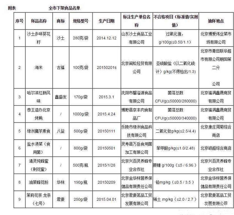 61少儿书刊网】北京食药监局在监督检查中发现“鑫盛发”哈尔滨红肠、恭王造办北京烤鸭等9种食品不合格,问题涉及菌落超标、稀土超标、铅超标等。菌落超标会引起胃肠道不适;稀土元素残留体内会对肝肾功能、神经系统产生不良影响。已买的赶紧退,扩散提醒!(据央视)