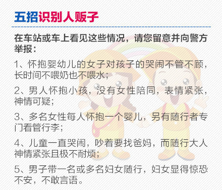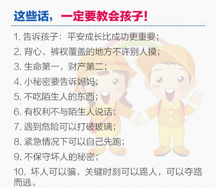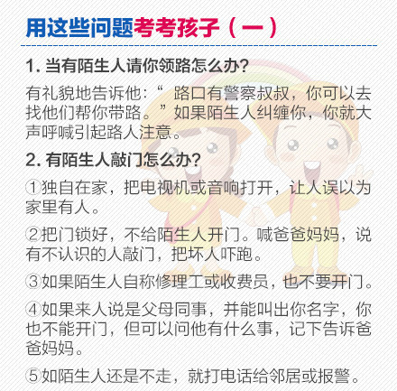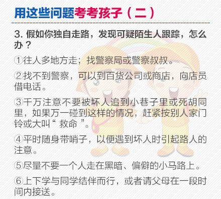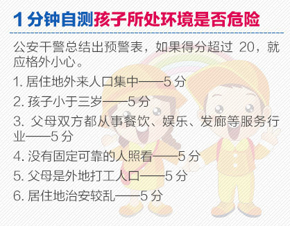 1分钟测试!看孩子环境是否安全:①居住地外来人口集中:5分;②孩子小于3岁:5分;③父母都从事餐饮、娱乐、理发等服务行业:5分;④没有固定可靠的人照看:5分;⑤父母是外地打工人口:5分;⑥居住地治安较乱:5分。如果总分超过20分,就应该格外小心。