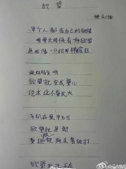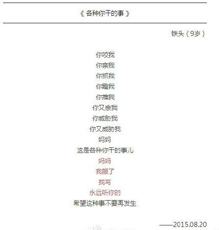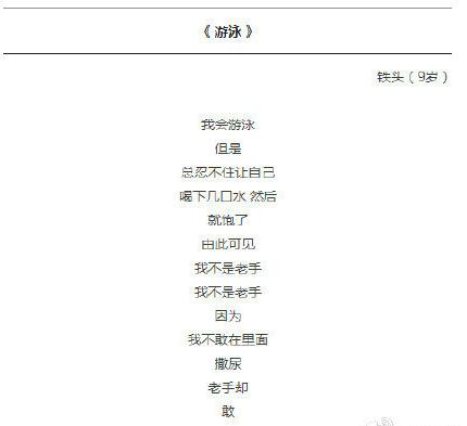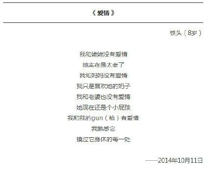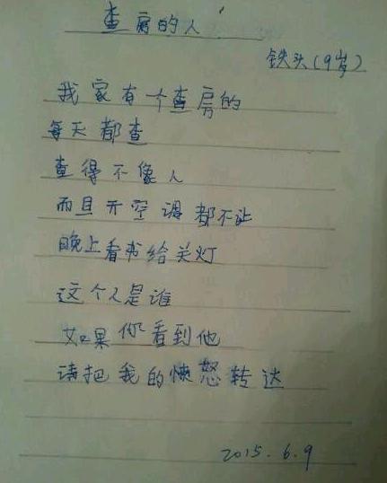 【少儿期刊】9岁的梁胜杰6岁开始写诗,如今已写成200多首。近日,其系列萌诗得到了清华大学出版社的出版。"开始是妈妈逼的,被逼到了9岁..."。他的诗,满是萌萌哒:“妈妈很贱,我爱她””“你推我你又亲我..妈妈我服了。