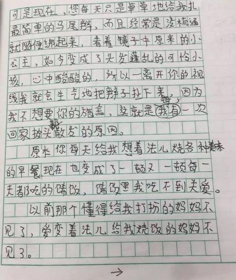 “以前那个懂得给我打扮的妈妈不见了,爱变着法儿给我烧饭的妈妈不见了。”