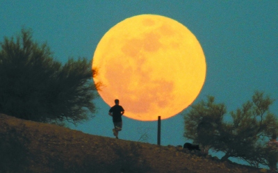以下图为例,小人所处的位置位于A点正上方,而A点西边是非洲大陆,东北方向一点点是马达加斯加。你只要处于地球南纬 30°,东经 37°这点附近的上空,距离地球表面大于月 2.5 万公里,镜头和地球之间无遮挡,然后这个小人站在你前面,就可以看到这一幕。
