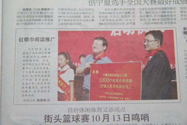 为引导广大少年儿童树立爱读书、读好书的良好习惯,培养善读书、活读书的意识,加强文化产品的创造和推广,为广大少年儿童提供更优质、便捷的文化服务,2012年9月25日,由中国少先队事业发展中心和宁夏自治区团委、少工委共同举办的“红领巾阅读推广计划—宁夏行”启动仪式在银川市第二十一小学举行。中国少先队事业发展中心副主任王溪,自治区团委副书记佘瑞东,自治区少工委副主任、综治办协调处副主任毕超等出席活动,来自银川市部分学校的校长、大队辅导员、少先队员代表和银川市第二十一小学全体师生共计2000余人参加了启动仪式。