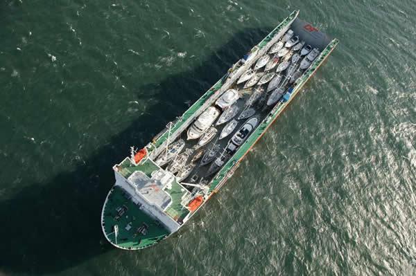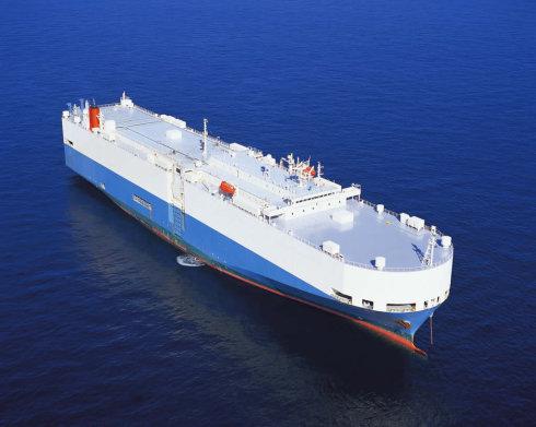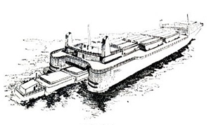 一艘庞大的轮船在靠近港口处停泊,突然,船身开始下沉,直到水下5米处才停止;接着,船头缓缓开启,如同一张大开的嘴巴;随后,汽笛声响起,12艘载重800吨的驳船被慢慢推进大船的“嘴”里;最后,“吃饱”的大船闭拢“嘴巴”,再次浮出水面,向大海驶去……